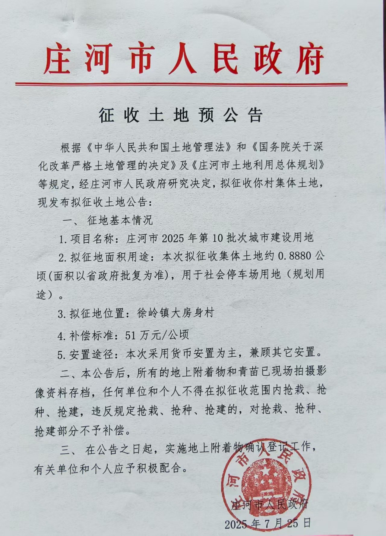 为实施我市土地利用总体规划,根据《中华人民共和国土地管理法》等法律法规规定,拟征收庄河市徐岭镇大房身村集体土地。本次拟征收集体土地约0.8880公顷(面积以省政府批复为准),用于社会停车场用地(规划用途)。目前已发布了征收土地预公告,现面向社会公开征求意见,欢迎积极参与,提出宝贵意见和建议。请于2025年8月15日前填写《反馈意见表》并以电子邮件形式反馈至自然资源局邮箱:gtj89814465@163.com。