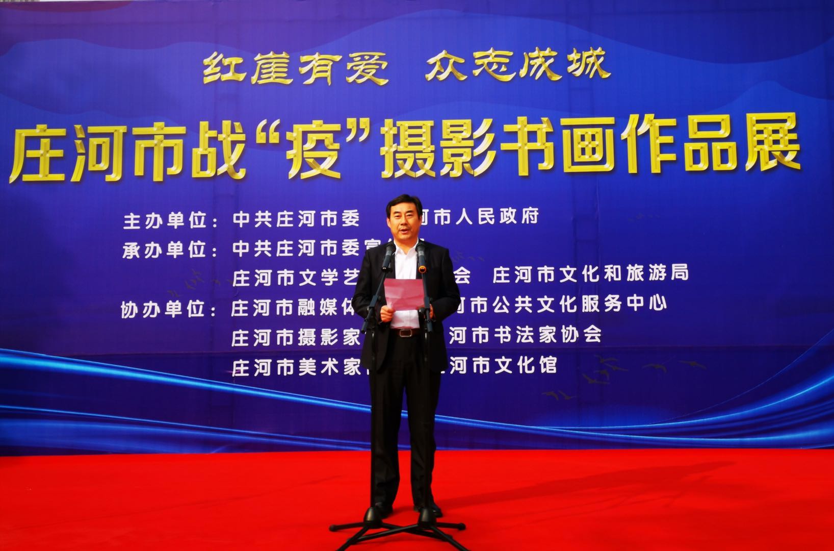 10月20日,“红崖有爱 众志成城”庄河市战“疫”摄影书画作品展在市文化馆展览厅隆重开展。市委书记吴澜出席开幕式并致辞。市人大常委会主任李永祥、市政协主席于德才出席开幕式。市委常委、宣传部长张春利主持开幕式。市委、市人大、市政府、市政协四大班子领导,北黄海经济开发区领导,市法院、市检察院以及各乡镇街道、部门、事业单位等领导、援鄂六勇士和部分医务工作者、公安干警、环卫工人、志愿者,乡村社区工作者代表等,应邀参加开幕式。